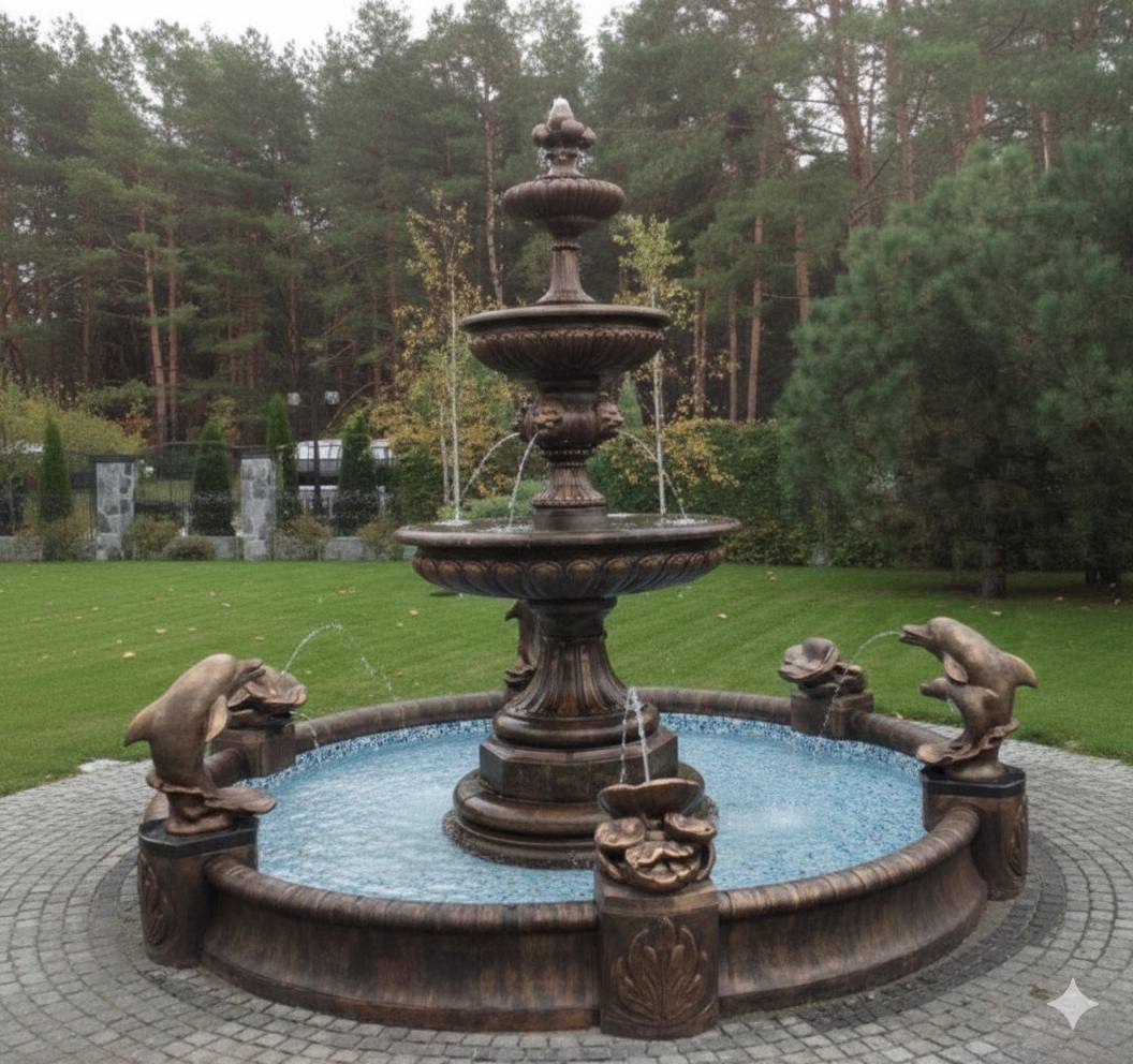 Этот бетонный фонтан имеет классический многоярусный дизайн. Он состоит из трёх уровней чаш, которые уменьшаются в размере к вершине. Вершину украшает декоративный элемент в виде изящной фигуры. Вокруг основания фонтана расположены четыре скульптуры дельфинов, которые «выпускают» струи воды в бассейн. Бассейн круглый, окружён бортиком с детализированным декором.