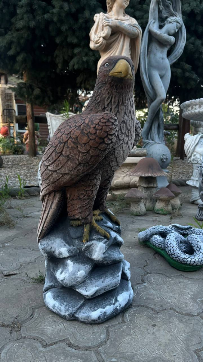 Величественная садовая фигура орла символизирует силу, свободу и благородство. Орел изображён в естественной позе, подчёркивающей его мощь и бдительность. Детально проработанное оперение, реалистичная окраска и фактурная скала делают фигуру максимально живой и выразительной.