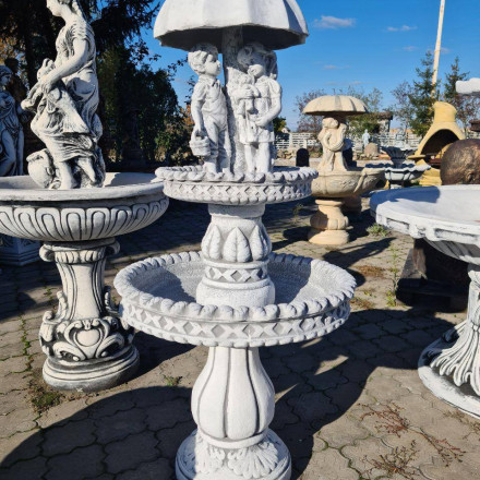 З висотою 160 см, фонтан "Флора 2х ярусний з дітками" вражає своєю величчю та вишуканістю. Два яруси, насичені деталями та орнаментами, вже самі по собі є справжнім витвором мистецтва. Додайте до цього чарівність дитячих фігурок, і ви отримаєте фонтан, що розповідає цілу історію про життя, природу та спільні миті щастя.