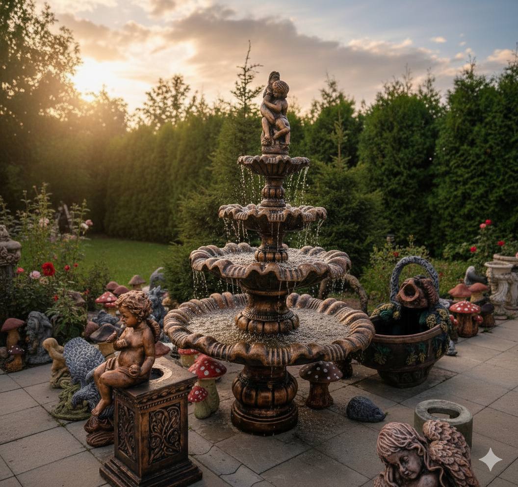 «Хвилястий чотириярусний» фонтан — це втілення класичної розкоші та витонченості. Завдяки значним розмірам та багаторівневій структурі, він стає домінуючим акцентом будь-якого ландшафту, перетворюючи звичайне подвір’я на розкішну зону відпочинку в палацовому стилі.